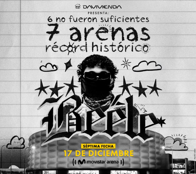 Beéle, el joven fenómeno de la música latina, llega al Movistar Arena de Bogotá este 20 de diciembre para presentar Borondo, su primer álbum de estudio. Con 26 canciones y más de cinco temas en el Top 50 de Spotify Colombia, el artista celebra su debut con un show imperdible. Su propuesta fusiona ritmos afrocaribeños con reguetón, pop, afrobeats y baladas, reflejando sus raíces de la costa colombiana y su conexión con los sonidos globales. Con millones de oyentes mensuales, Beéle se consolida como una de las voces más frescas de la escena urbana. Una noche única para sentir el sabor del Caribe en el corazón de la ciudad