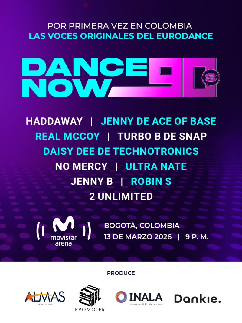 DANCE NOW TOUR 2026, el festival que es tendencia mundial llega a Bogotá. Una noche única e irrepetible con lo mejor de los noventa. Presentaciones en vivo con 10 artistas originales en escena: Haddaway, Jenny de Ace Of Base, Real Mccoy, Daisy Dee de Technotronics , Turbo B de Snap, Jenny B, No Mercy, Robin S, 2 UNLIMITED y Ultra Nate.