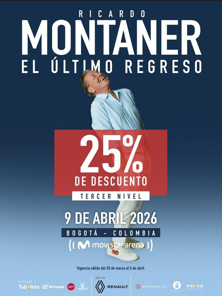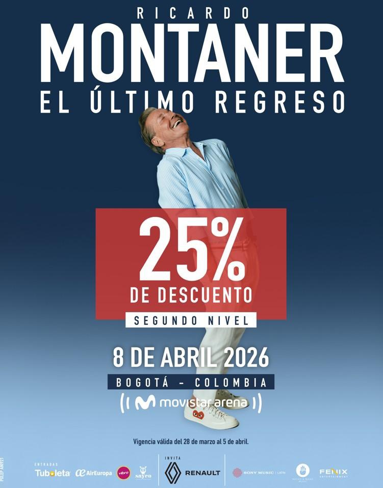 El 8 de abril de 2026, el Movistar Arena de Bogotá abrirá nuevamente sus puertas para recibir a Ricardo Montaner, quien suma una segunda fecha de su aclamado espectáculo “El Último Regreso Tour”, tras el éxito en ventas de su primera presentación en la capital.Reconocido por su cercanía con el público y su don para transformar las emociones en canciones, Montaner ofrecerá mucho más que un concierto: será un reencuentro íntimo con sus seguidores, un recorrido por melodías que han acompañado historias de amor, nostalgia y esperanza a lo largo de generaciones. En una atmósfera cálida y profundamente emotiva, temas como “Te quiero”, “Déjame llorar” y otros clásicos del corazón volverán a crear ese lazo único entre el artista y su público.Los asistentes vivirán una noche colmada de música, anécdotas y momentos compartidos, donde la sensibilidad y el carisma de Ricardo Montaner confirmarán, una vez más, por qué su obra sigue vigente y trasciende el tiempo, las modas y las generaciones. -