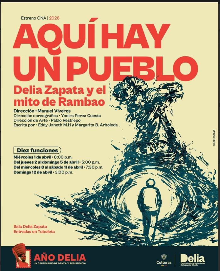 ‘Aquí hay un pueblo’ traza el proceso mediante el cual una comunidad se adapta a la violencia hasta integrarla en su funcionamiento cotidiano. La Poetisa, figura alegórica inspirada en Delia Zapata Olivella, aparece como una presencia que nombra y registra. A través de rituales alterados, danzas tradicionales deformadas y cruces con la danza afrocontemporánea, la obra construye un cuerpo colectivo donde el rito pierde espesor simbólico y la violencia se inscribe sin escándalo. No hay cierre ni consuelo. Queda la marca. Aquí hay un pueblo.